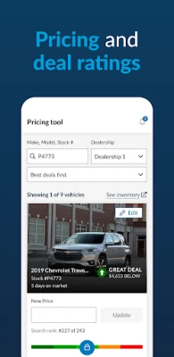 With the app you can access your current CarGurus account to: • Use the Pricing Tool to review your current deal ratings and make price changes • Access IMV Scan so you can quickly and easily get the Instant Market Value of a potential trade-in or auction vehicle • See your current inventory listings • Review recent lead metrics