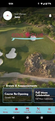 Welcome to the Cove Club app, where the experience of our members is our primary focus. We have developed a custom app to enhance your experience on and off property. With only a couple of taps, you can present a digital membership card for staff. You also have easy access to detailed information about the club and to a full club calendar. There are even several ways to communicate with us, including requesting transportation services, making a tee time, or booking a fitness class. We hope you enjoy the digital Cove Club experience.