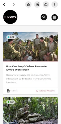 The Cove is the Australian Army’s professional military education (PME) platform. The Cove facilitates access to resources and events relating to the profession of arms. It also encourages user participation that shares personal views, knowledge and experience. The Cove is designed to connect Defence members to a professional network in order to share expertise, contest ideas and promote continuous learning.